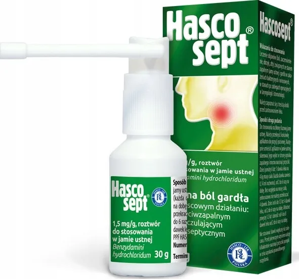 - Hascosept spray - zawiera składniki antyseptyczne, które pomagają w walce z infekcjami gardła, przynosząc ulgę w krótkim czasie.